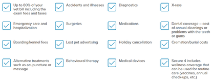 Generally, if your pet has an accident or gets sick, your policy will cover the following according to the plan you've selected: